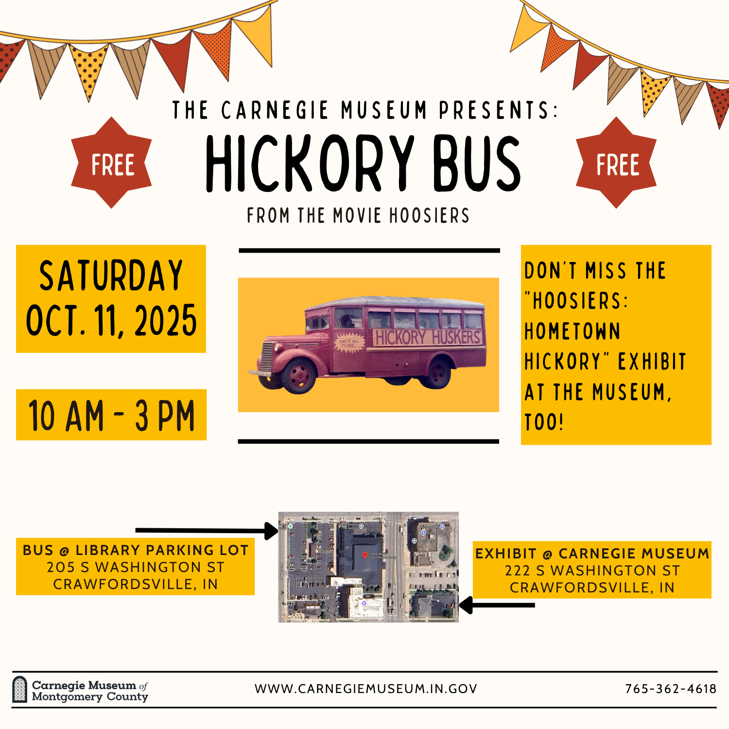 October 11, 2025 | Celebrate the 40th anniversary of the filming of the movie Hoosiers! On Saturday, October 11, from 10 am to 3 pm, come see the Hickory Huskers Bus in the Crawfordsville Public Library parking lot (205 S. Washington Street). Tour the bus and learn about its use in the movie.